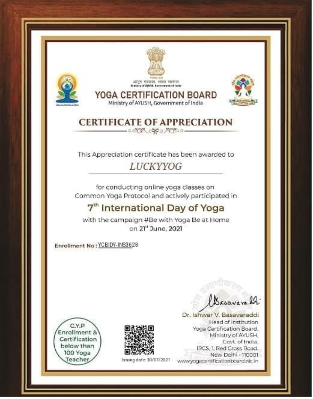 YOGA CERTIFICATION BOARD Ministry of AYUSH, Government of India CERTIFICATE OF APPRECIATION This Appreciation certificate has been awarded to LUCKYYOG for conducting online yoga classes in Common Yoga Protocol and actively participated in 7th International Day of Yoga with the campaign slogan "Be With Yoga, Be At Home" on 21st June 2021 Enrollment No: YCB/CYP/INS/0628 Additional information at the bottom includes: CYP Enrollment & Certification below 100 Yoga Teachers -Training Date: 20/06/2021 - QR codes, signature, and more detailed information about the certification.